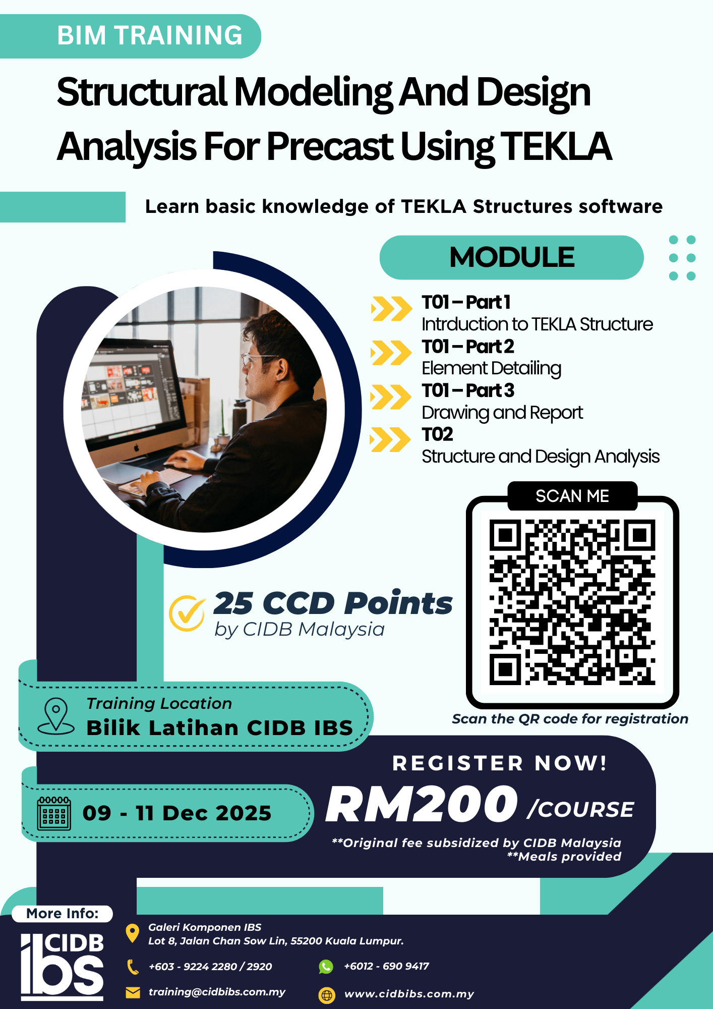 This training program is for those who have a civil or structural engineering background or at least 1 year of relevant working experience in building construction or structural design. This course also suitable for academicians, students and public agencies as well as other personnel that specify, produce or refer in IBS project executions.